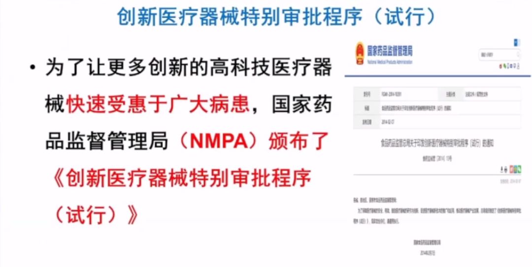 2014年2月7日,為保障醫(yī)療器械的安全有效,鼓勵醫(yī)療器械的研究與創(chuàng)新,促進(jìn)醫(yī)療器械新技術(shù)的推廣應(yīng)用,推動醫(yī)療器械產(chǎn)業(yè)發(fā)展,國家藥監(jiān)局制定了《創(chuàng)新醫(yī)療器械特別審批程序(試行)》,政策從創(chuàng)新產(chǎn)品定義、提交資料、證明性文件、等方面規(guī)定了創(chuàng)新器械審批流程和要點(diǎn)。