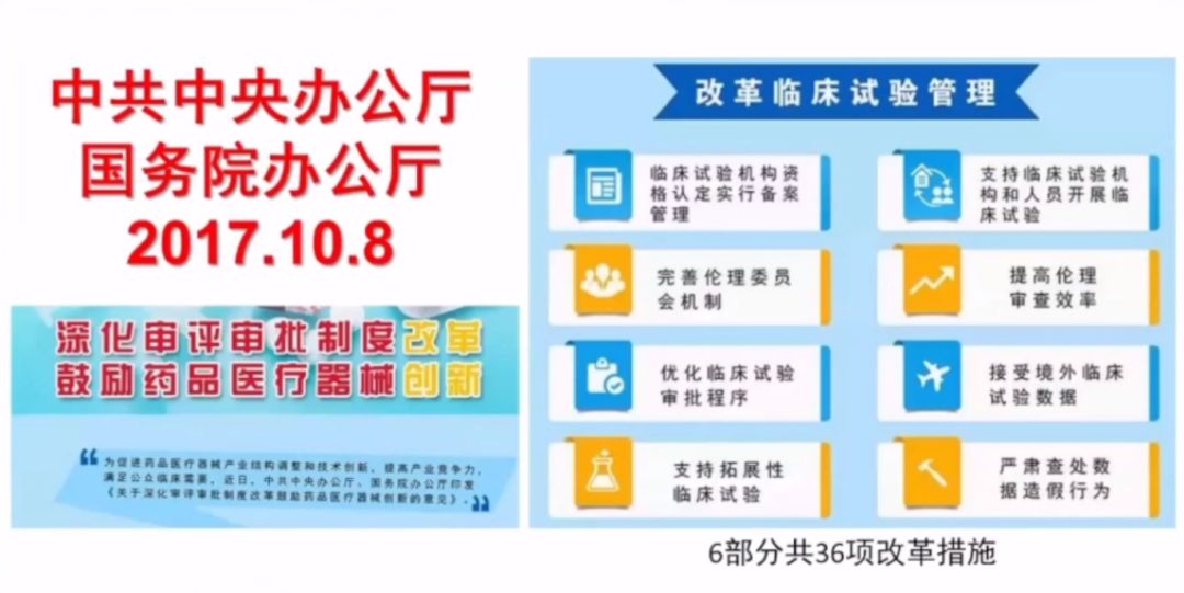 2017年10月8日,為鼓勵藥品醫(yī)療器械科技創(chuàng)新,提高上市產(chǎn)品質(zhì)量和產(chǎn)業(yè)競爭力,滿足公眾臨床需要,中共中央辦公廳、國務(wù)院辦公廳印發(fā)了《關(guān)于深化審評審批制度改革鼓勵藥品醫(yī)療器械創(chuàng)新的意見》。在多方面深化了審批制度,包括改革臨床試驗管理、加快上市審評審批、促進(jìn)藥品創(chuàng)新和仿制藥發(fā)展、加強(qiáng)藥品醫(yī)療器械全生命周期管理、提升技術(shù)支撐能力、加強(qiáng)組織實施等。