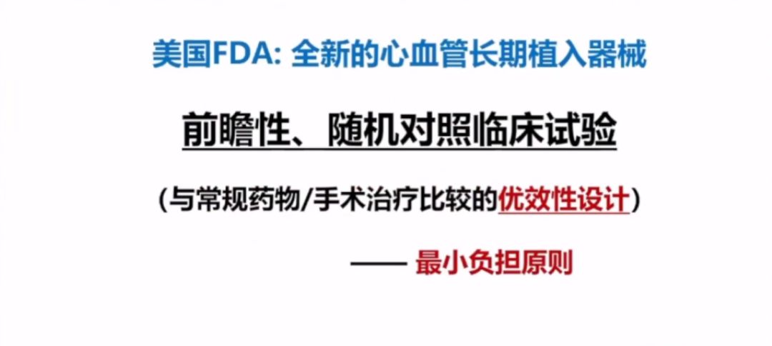 李衛(wèi)教授講到,美國FDA針對全新的心血管長期植入器械,也要做前瞻性、隨機(jī)對照臨床試驗。創(chuàng)新產(chǎn)品無同類產(chǎn)品可對照,可與常規(guī)的藥物/手術(shù)治療比較的優(yōu)效性設(shè)計,也就是最小負(fù)擔(dān)原則。