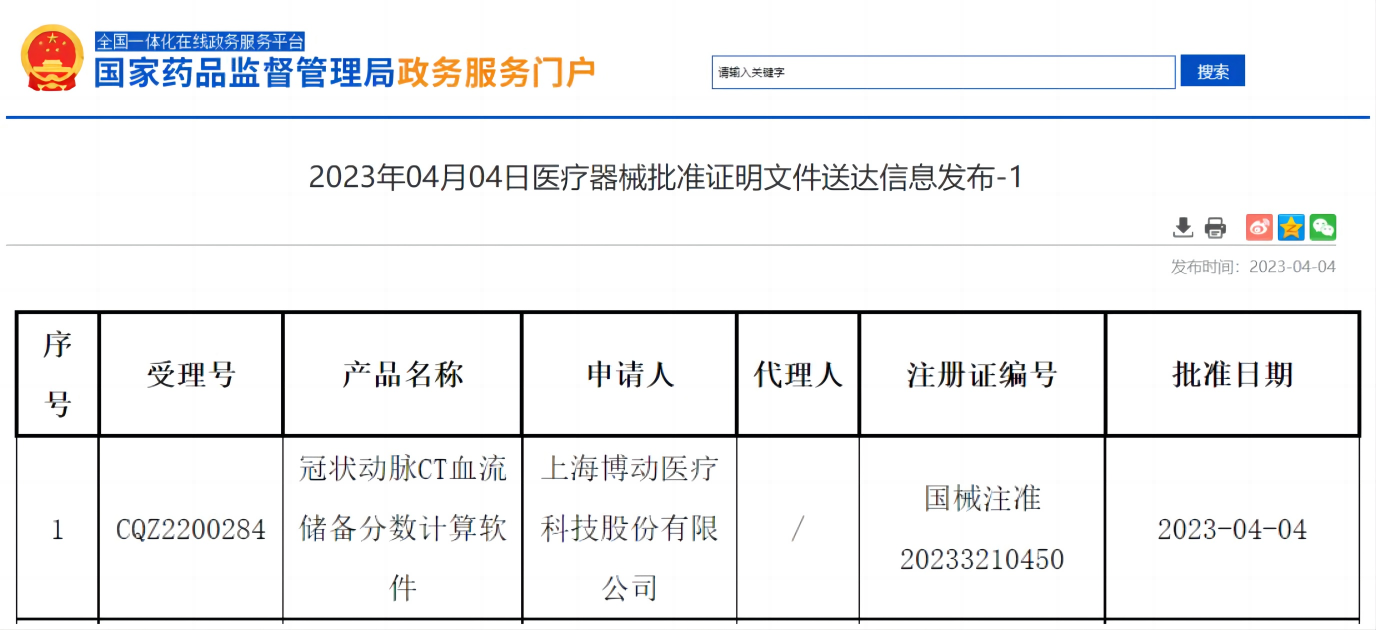 2023年4月4日,經國家藥監(jiān)局NMPA公示,上海博動醫(yī)療科技股份有限公司的創(chuàng)新醫(yī)療器械“冠狀動脈CT血流儲備分數計算軟件”(國械注準20233210450)獲得國家藥品監(jiān)督管理局批準上市,奧泰康承擔本項目臨床試驗服務,系2023年奧泰康助力獲得的第六張三類醫(yī)療器械注冊證。