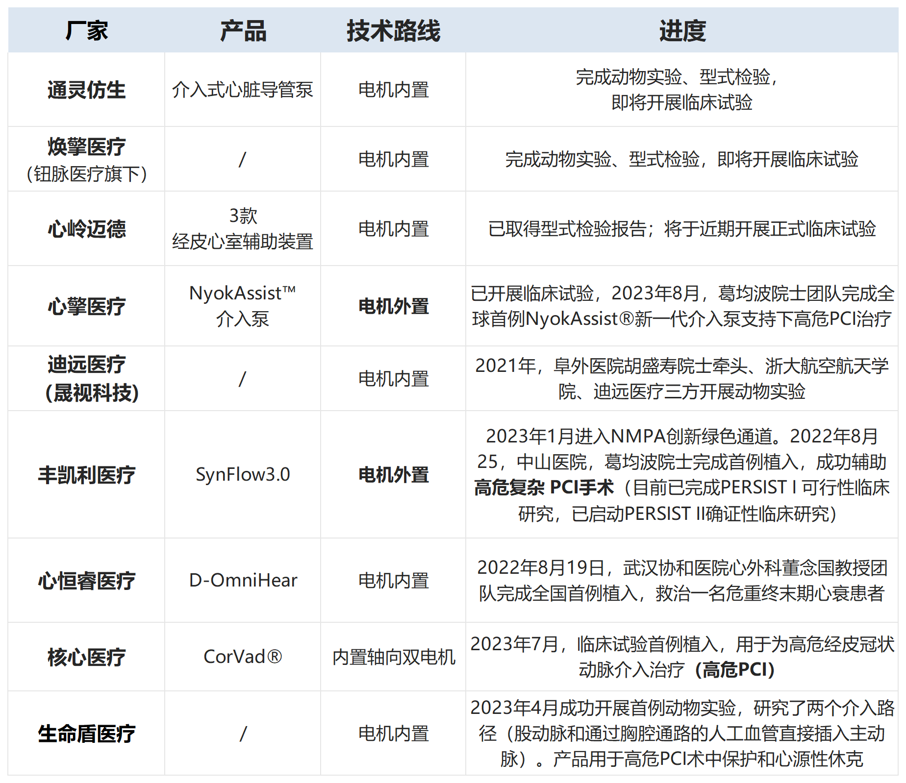 介入式人工心臟是高技術、高門檻賽道,國內有少數(shù)創(chuàng)新企業(yè)布局。其中,心恒睿醫(yī)療、核心醫(yī)療、通靈仿生、心嶺邁德、晟視科技、心擎醫(yī)療、豐凱利醫(yī)療等企業(yè)不僅在資本寒冬期逆勢完成融資,且相關產品推進順利,進展極快。