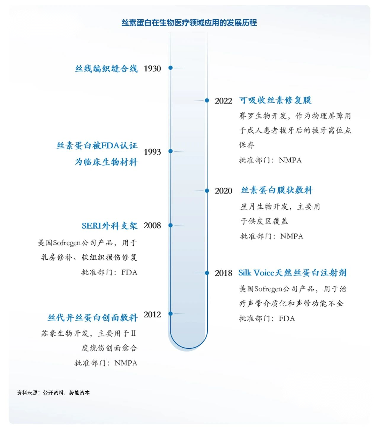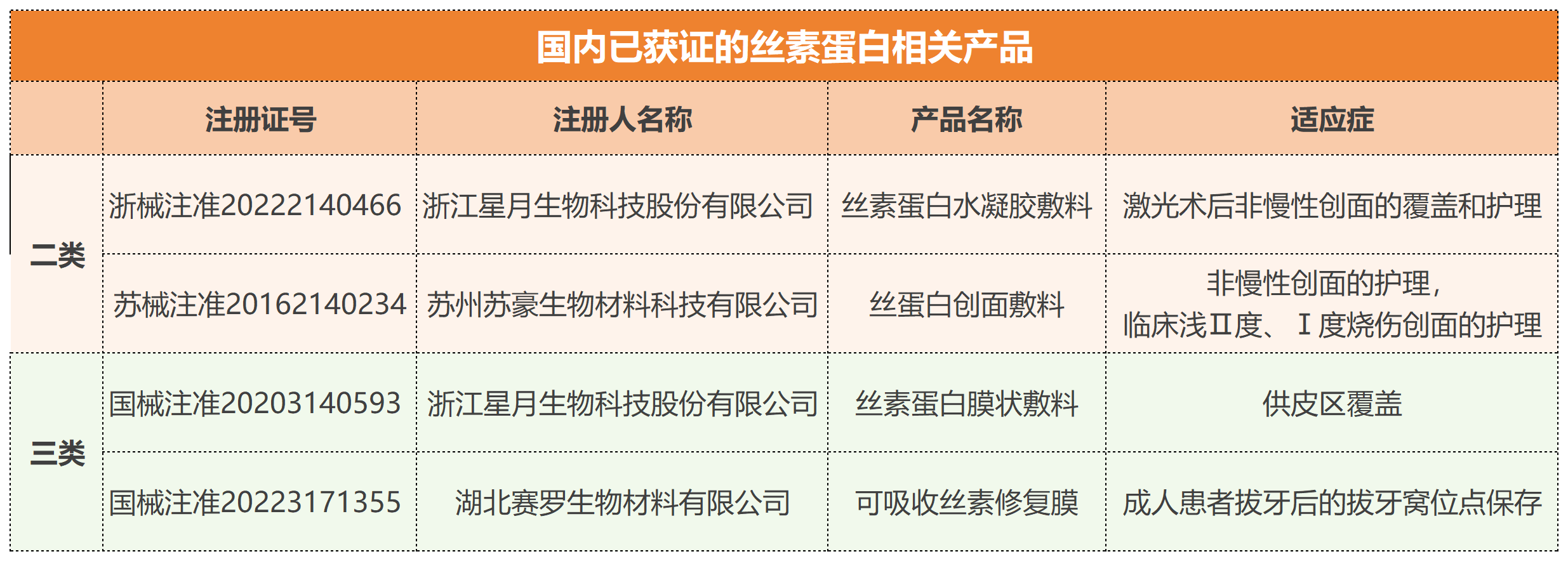 市面已對(duì)絲素蛋白制備的做了廣泛探究,目前成功商業(yè)化的產(chǎn)品不多(蠶絲縫合線、SERI外科支架、絲蛋白創(chuàng)面敷料、可吸收手術(shù)修復(fù)膜、Silk Voice®注射劑等),目前國(guó)內(nèi)共四款絲素蛋白產(chǎn)品獲批,其中僅一款為可吸收產(chǎn)品,說(shuō)明市場(chǎng)仍具有巨大發(fā)展?jié)摿Α?/em>
