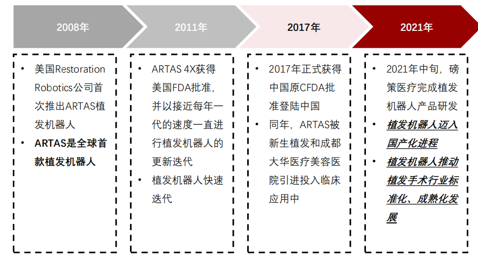 美國Restoration Robotics公司的植發(fā)機器人ARTAS是全球首款植發(fā)機器人,對醫(yī)師來說是個革命性的新工具,2017年被引入中國,陸續(xù)在北京八大處醫(yī)院、復旦大學華山醫(yī)院、北京中日友好醫(yī)院等多家醫(yī)院落地。植發(fā)機器人的出現(xiàn)標志著智能化FUE時代的到來,植發(fā)機器人的運用,將促進植發(fā)行業(yè)標準化發(fā)展,成功填補中國植發(fā)領域智能技術的空白。