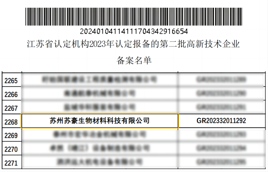 根據(jù)《高新技術(shù)企業(yè)認(rèn)定管理辦法》和《高新技術(shù)企業(yè)認(rèn)定管理工作指引》有關(guān)規(guī)定,全國(guó)高新技術(shù)企業(yè)認(rèn)定管理工作領(lǐng)導(dǎo)小組辦公室公告了江蘇省認(rèn)定機(jī)構(gòu)2023年認(rèn)定報(bào)備的第二批高新技術(shù)企業(yè)名單,奧泰康蘇州CDMO中心——蘇州蘇豪生物材料科技有限公司榮列其中,獲得江蘇省高新技術(shù)企業(yè)認(rèn)定,這是奧泰康企業(yè)發(fā)展歷程中的重要里程碑。