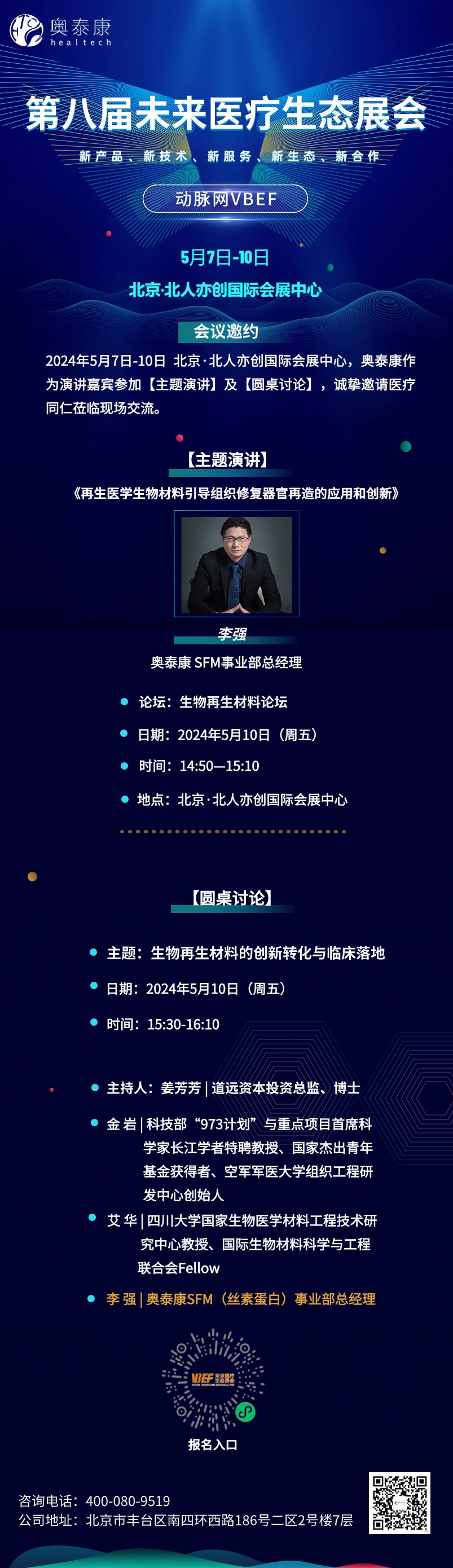 ??動(dòng)脈網(wǎng)·VBEF——第八屆未來醫(yī)療生態(tài)展會(huì),奧泰康·再生醫(yī)學(xué)生物材料演講???5月10日,與您相約??北京·北人亦創(chuàng)國(guó)際會(huì)展中心5月7日-10日,動(dòng)脈網(wǎng)VBEF第八屆未來醫(yī)療生態(tài)展會(huì)將于北京·北人亦創(chuàng)國(guó)際會(huì)展中心舉行,奧泰康作為演講嘉賓,受邀參加主題演講及圓桌討論,誠(chéng)摯邀請(qǐng)醫(yī)療同仁屆時(shí)蒞臨現(xiàn)場(chǎng)交流。