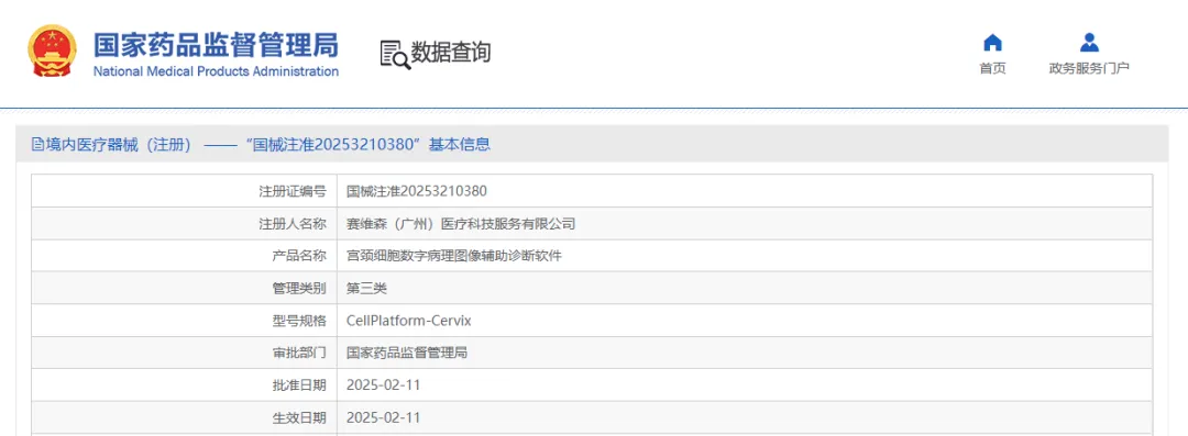 賽維森科技自主研發(fā)的“宮頸細(xì)胞數(shù)字病理圖像輔助診斷軟件”,正式獲得國家藥監(jiān)局(NMPA)頒發(fā)的第三類醫(yī)療器械注冊(cè)證,是宮頸細(xì)胞學(xué)領(lǐng)域首張“輔助診斷”三類證。人工智能正式升級(jí)為醫(yī)生的“超級(jí)助手”!(注冊(cè)證編號(hào):國械注準(zhǔn)20253210380)