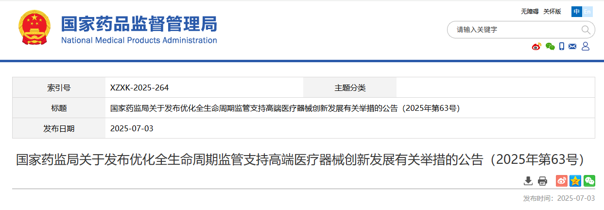 國家藥監(jiān)局關(guān)于發(fā)布優(yōu)化全生命周期監(jiān)管支持「高端醫(yī)療器械」創(chuàng)新發(fā)展有關(guān)舉措的公告(2025年第63號(hào))醫(yī)用機(jī)器人、高端醫(yī)學(xué)影像設(shè)備、人工智能醫(yī)療器械和新型生物材料醫(yī)療器械等(以下簡稱高端醫(yī)療器械)是塑造醫(yī)療器械新質(zhì)生產(chǎn)力的關(guān)鍵領(lǐng)域。為深入貫徹黨的二十屆三中全會(huì)精神,落實(shí)《國務(wù)院辦公廳關(guān)于全面深化藥品醫(yī)療器械監(jiān)管改革促進(jìn)醫(yī)藥產(chǎn)業(yè)高質(zhì)量發(fā)展的意見》(國辦發(fā)〔2024〕53號(hào))要求,完善審評(píng)審批機(jī)制,加強(qiáng)全生命周期監(jiān)管,全力支持高端醫(yī)療器械重大創(chuàng)新,促進(jìn)更多新技術(shù)、新材料、新工藝和新方法應(yīng)用于醫(yī)療健康領(lǐng)域,更好滿足人民群眾健康需求,提升我國高端醫(yī)療器械國際競爭力,國家藥監(jiān)局提出以下支持舉措。
